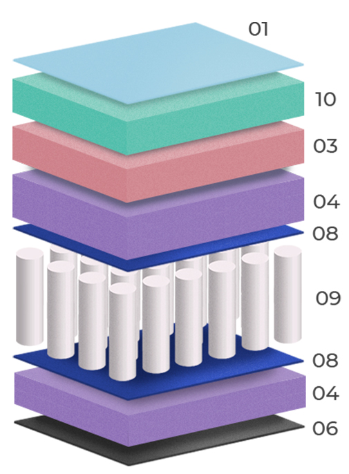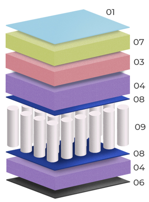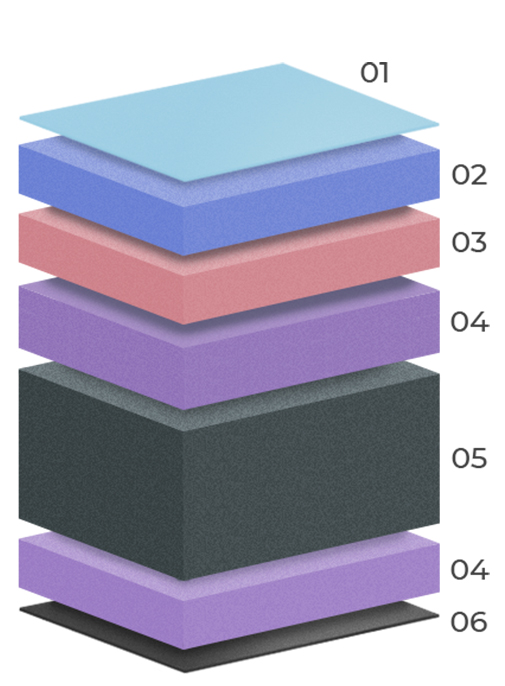 01 – Tecido malha tencel matelassê localizado 02 – Espuma de alta densidade 03 – Espuma HR (High Densidade) 04 – Camada monochoque (Espuma de Alta Densidade) 05 – Base isotérmica