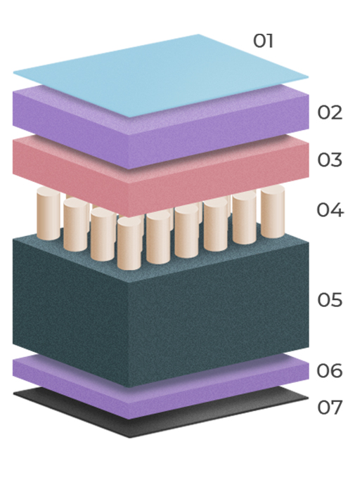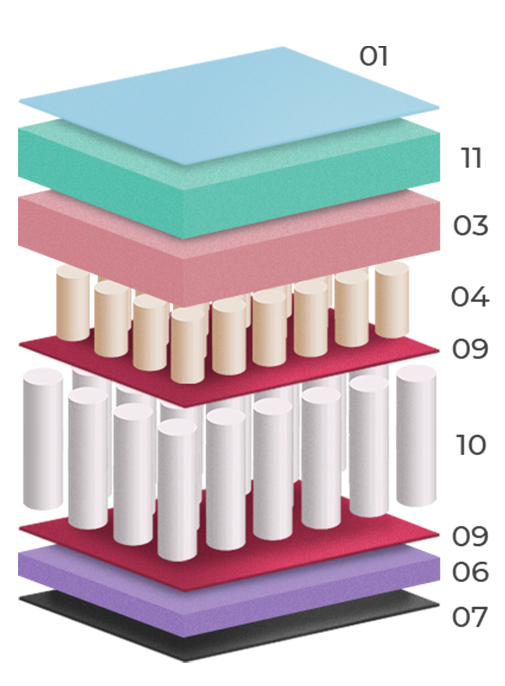 01 – Tecido malha tencel matelassê localizado 02 – Espuma de alta densidade 03 – Espuma HR (High Resilience) 04 – Minimolas 05 – Flexline (AG de Alta Densidade) 06 – Camada monochoque (Espuma de Alta Densidade) 07 – Tecido antideslizante